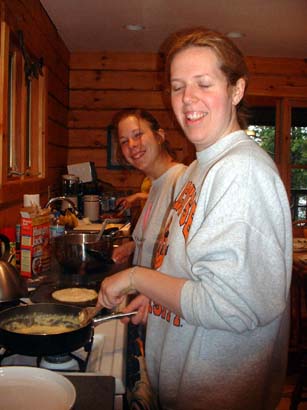 Jen and Dawn are on pancake duty this morning. Aren't we cute in our pajamas? |