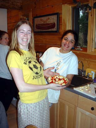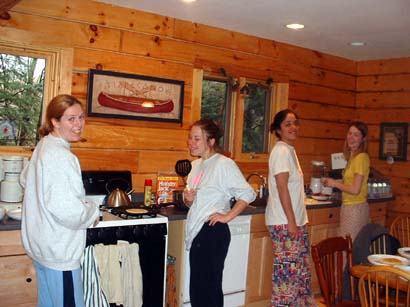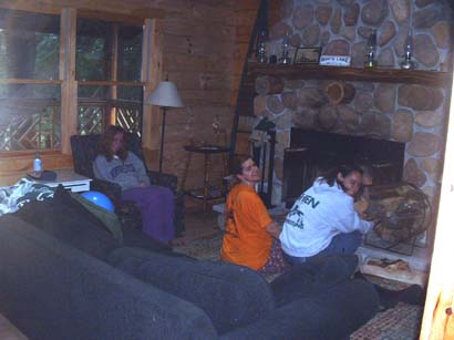 The next morning...Caitlin L. shouts good morning and gracefully sails through the air -- landing on the bed we've all gathered on for morning gossip. This rouses us from the routine of a hangover-morning and we get ready for the day (slowwwwwwwlllllyy and in the dark). Nicole and Laura start a fire as Caitlin offers helpful suggestions from her vantage point on the easy chair. |