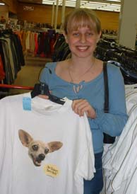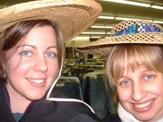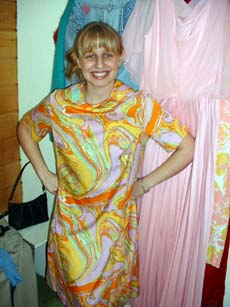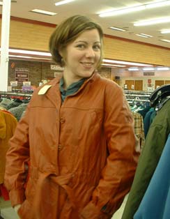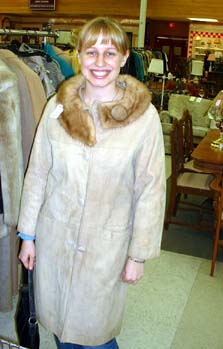 | Who knew that Troy, NY houses one of the HOTTEST S&A Boutiques around?!?! | Such fashionable clothing!! We love the retro coats, but found that most of them had sleeves that were just way too short. Were women formerly appendage-ly challenged, or are we orangutans? | Rust-orange leather like this must have come from an exotic animal of some sort: can we say "natural water repellent"?!?! I THINK WE CAN!! | Carrie models a psychadelic dress from a bygone era. I bet the girl who last owned this had some serious fun; who needs chemical stimulants when you've got a girlfriend wearing a dress like this?! | Another great feature of commercial thrift stores: the extensive audience they con into donating goods. Carrie finds a shirt with a picture of someone else's pet plastered on the front. "Big deal," you say? THINK AGAIN, BUDDY!! The key here is that whoever made this shirt must have previously owned Carrie's newly acquired dog, because it looks EXACTLY like Lucy!! | We are ready to hit the beach (or perhaps the set of "Oklahoma!") in these stylish-ish straw head coverings. Available with or without contrasting ribbons. Yours for only $1.19 only at Salvation Army! |