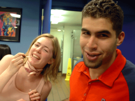 Then she tries to put some lip gloss on Luis (sporting Spiderman attire in hopes that someone would ask him for an autograph). He fights hard to avoid her...closing his eyes and wishing himself far far away.